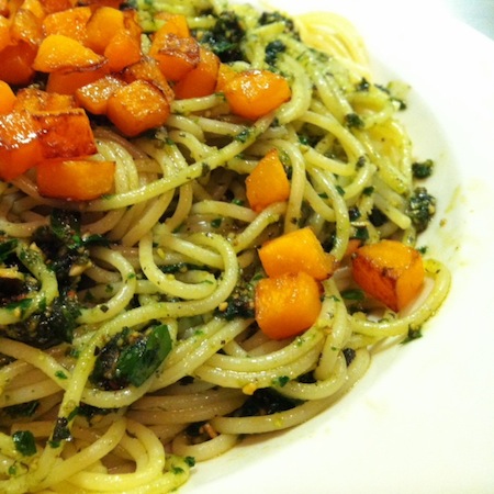 Spaghetti an Kürbiskernpesto mit Kürbiswürfeln