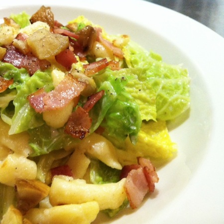 160 g Wirz in Streifen schneiden und in Salzwasser blanchieren. 80 g Bratspeck in Streifen anbraten und zur Seite stellen. Im ausgelassenen Speckfett 500 g Quarkspätzli oder fixfertig gekaufe Spätzli goldbraun anbraten. Derweil in einer anderen Pfanne 50 g gehackte Marroni in Butter anbraten und mit wenig Zucker caramelisieren. Anschliessend Wirz, Speckstreifen und Marroni zufügen, mit Salz und Pfeffer abschmecken und 1.2 dl leicht geschlagener Rahm unterheben.
