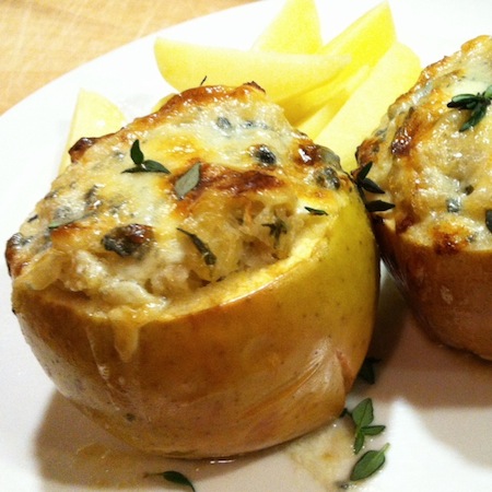 Bei 4 Äpfeln den Deckel wegschneiden und aushöhlen, das Fruchtfleisch beiseite stellen. In wenig Öl 1 gehackte Schalotte anbraten, 1 Handvoll gehacktes Apfelfruchtfleisch beigeben, 1 EL Honig, 1 EL frische Thymianblättchen, 1 Schuss Apfelsaft und 200 g mildes, gekochtes Sauerkraut beifügen. Einige Minuten köcheln, mit Salz und Pfeffer abschmecken. Die ausgehöhlten Äpfel in eine gebutterte Gratinform stellen und mit der Sauerkrautmischung füllen. 50 g Roquefort mit 100 g Crème fraîche mischen und über die Äpfel verteilen. Etwas Apfelsaft in die Gratinform giessen, im vorgeheizten Backofen bei 180°C etwa 25 Min. backen. Mit Salzkartoffen servieren. Quelle: Mestolo