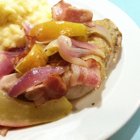 2 Pouletschenkel in Butter einige Minuten goldbraun anbraten und zur Seite stellen. 1 in Schnitze geschnittene rote Zwiebel im Bratensatz andämpfen, 80 g in Stücke geschnittenen Bratspeck mitbraten. Pouletschenkel wieder beifügen, mit 3 dl saurem Most aufgiessen und salzen. 30 Min. auf kleiner Flamme köcheln. 1 festfleischiger, in Schnitze geschnittener Apfel beifügen und weitere 10 Min. köcheln lassen. Mit Kartoffelstock servieren. Quelle: Nigel Slater