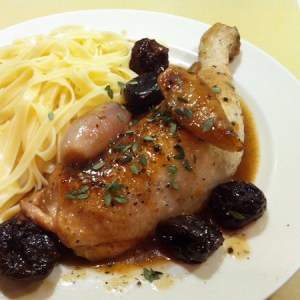Pouletschenkel mit Pflaumen und Schalotten