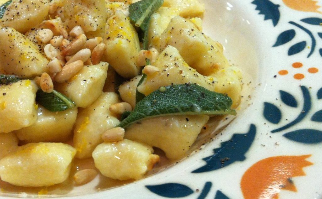 500 g Ricotta mit 2 Eigelb, 60 g geriebenem Parmesan, dem Abgeriebenen von 1/2 Zitrone und einer Prise Salz vermengen. 120 g Mehl beifügen und zügig untermischen. Die Ricottamasse in einen Spritzsack mit 1 cm Tülle füllen und lange Würste auf eine gut bemehlte Arbeitsfläche spritzen. Ricottawürste sogleich im Mehl wenden und mit einem Teighorn in kurze Stücke schneiden und lose nebeneinander auf ein mit Backpapier belegtes Blech geben. Gnocchi bis zur weiteren Verwendung kaltstellen. 80 g Butter aufschäumen lassen, 1 Handvoll Salbeiblätter dazugeben und einige Min. braten. Gnocci derweil in leicht köchelndem Salzwasser gar ziehen lassen und mit einer Schaumkelle herausheben, sobald sie an die Oberfläche steigen. Gnocchi in die Salbeibutter geben, 50 g geröstete, grob gehackte Pinienkerne und Abgeriebenes von 1/2 Zitrone beigeben und 2 Min. in der Salbeibutter schwenken. Sogleich servieren. Quelle: Annemarie Wildeisen’s KOCHEN