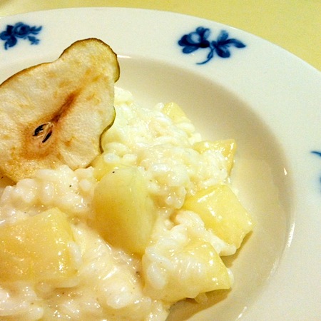 In wenig Butter und Olivenöl eine kleine gehackte Zwiebel andünsten. 200 g Risottoreis dazugeben und mitdünsten. 1 Birne schälen, in kleine Würfel schneiden und ebenfalls beigeben. 2 dl Weisswein dazugiessen und einkochen lassen. Nach und nach 5 dl Geflügelbouillon beigeben und den Reis unter Rühren bissfest kochen. 100 g in Würfel geschnittenen Taleggio unterrühren und schmelzen lassen. Den Risotto kurz ziehen lassen und servieren. Quelle: Annemarie Wildeisen’s KOCHEN