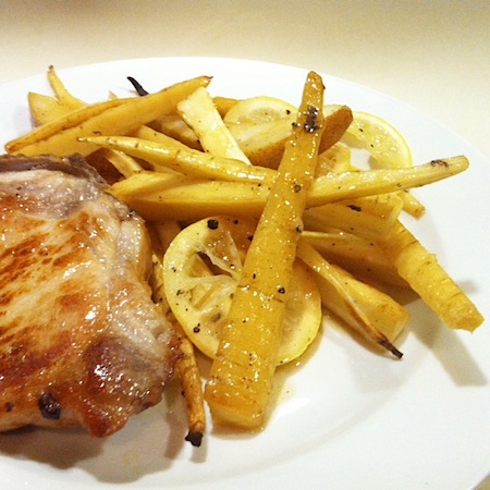 2 Schweinskotelettes in wenig Bratbutter beidseitig goldbraun anbraten. In einer kleinen Pfanne 30 g Butter und 1 EL Birnel schmelzen. Bei 1 Birne Kerngehäuse entfernen und in ca. 1 cm dicke Schnitze schneiden. 250 g Pastinaken putzen und ebenfalls in Schnitze schneiden. In einer Gratinform die Birnen- und Pastinakenschnitze zusammen mit 1/2 Zitrone in dünnen Scheiben und der geschmolzenen Butter mischen. Salzen und pfeffern. Die Kotelettes daraufgeben. Im auf 200° C vorgeheizten Backofen ca. 30 Min. rösten. Quelle: Donna Hay