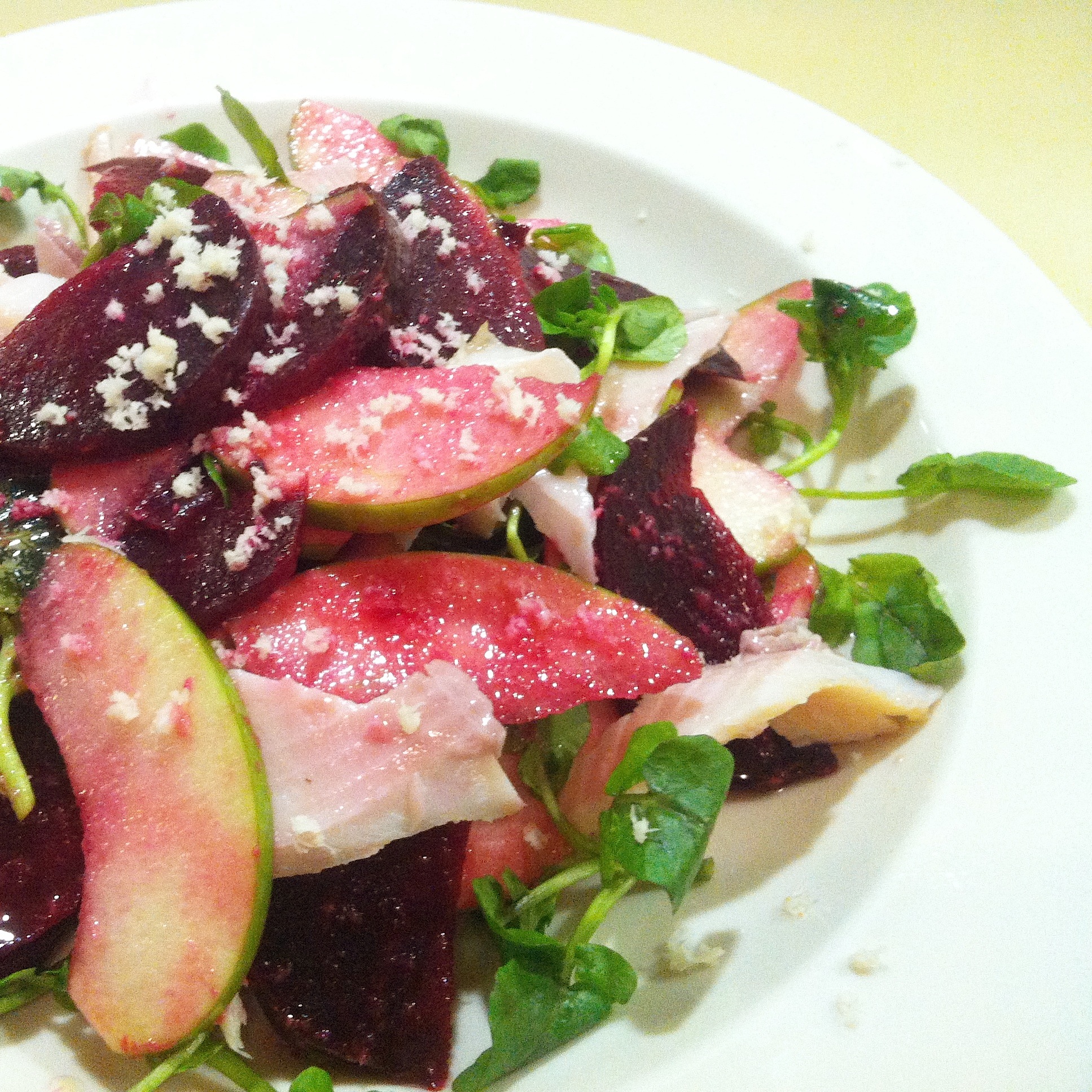 2 kleine Randen im Backofen bei 180° C in Alufolie eingewickelt 1 Std. garen und anschliessend erkalten lassen. Aus 1 EL Zitronensaft, 2 EL Olivenöl und 1 EL Meerrettich (frisch gerieben oder aus dem Glas) einen Dressing mischen. Die Randen schälen, halbieren und in feine Spalten schneiden. 1 Apfel (z.B. Granny Smith) halbieren, Kerngehäuse entfernen und ebenfalls in feine Spalten schneiden. Randen- und Apfelspalten zusammen mit 40 g Brunnenkresse und dem Dressing in einer Schüssel behutsam mischen. Salat mit 100 g grob zerpflückten Forellenfilets auf 2 Tellern anrichten. Mit etwas fein geriebenem Meerrettich bestreuen.