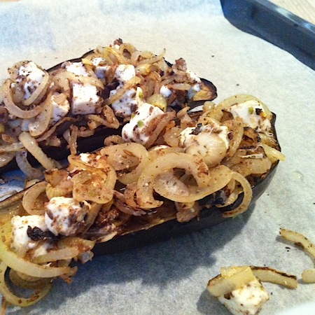 2 kleine Auberginen halbieren, Schnittfläche rautenartig einschneiden, mit 4 EL Olivenöl bestreichen, Salzen und Peffern. Im auf 200° C vorgeheizten Backofen 45 Min. backen. 1 Zitrone filetieren, Fruchtfleisch kleinschneiden und zusammen mit dem Zitronensaft und 1/2 gehackter Knoblauchzehe mischen. 15 Min. vor Ende der Backzeit 3 Zweibeln schälen, halbieren und in dünne Scheiben schneiden. In wenig Olivenöl 10 Min. braten, bis die Zwiebeln leicht gebräunt sind. 1 gehäufter TL grob gemahlener Kreuzkümmel, 1 EL Sumac und 1 fein gehackte grüne Chili darüberstreuen und weitere 2 Min. dünsten. 100 g klein gewürfelter Feta beifügen und solange erwärmen, bis der Feta leicht geschmolzen ist. Auberginen aus dem Ofen nehmen, mit der Zitronenmischung beträufeln und Zwiebel-Feta-Mischung darübergeben. Mit schwarzem Pfeffer bestreuen. Quelle: Yotam Ottolenghi