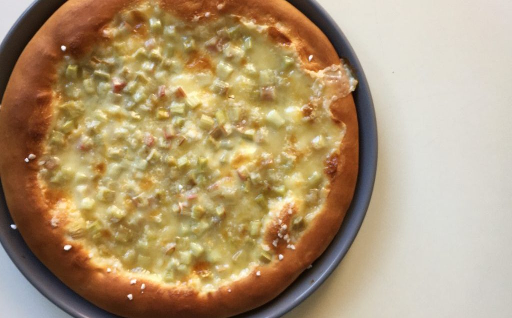 10 g Hefe in 1 dl lauwarmer Milch zergehen lassen. Hefemilch, 250 g Mehl, 1 Prise Salz, 1 Ei und 50 g zimmerwarme Butter zu einem Teig kneten. Den Teig auswallen, auf ein gebuttertes Kuchenblech (28 cm Durchmesser) geben, mit Klarsichtfolie abdecken und etwa 1 Std. aufgehen lassen. Teig dem Formrand entlang hochdrücken, so dass eine Rinne entsteht. Mit den Fingern tiefe Löcher in den Teig drücken. 90 g Doppelrahm auf den Kuchen streichen. 80 g Rhabarber in 1-2 cm grosse Würfel schneiden, auf den Teig geben und etwas eindrücken. Mit 60 g Hagelzucker (oder normalem Kristallzucker) bestreuen. Den Kuchen ca. 17 Min. im vorgeheizten Backofen bei 200° C backen. Quelle: Werner Rätz, Auberge des Clefs, Lugnorre, FR