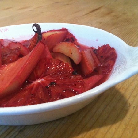 200 g Rhabarber schräg in ca. 4 cm lange Stücke schneiden. 1 Blutorange schälen, weiße Haut vollständig entfernen und in dünne Scheiben schneiden. Rhabarber und Orangenstücke in zwei ofenfeste Formen geben. 1/2 Vanilleschote längs aufschneiden, Samen auskratzen. Vanillesamen und je 1 Schotenstück über die Früchte verteilen. Saft 1/2 Blutorange über die Früchte geben und mit je 1 EL Rohrohrzucker bestreuen. Formen mit Alufolie bedecken und im vorgeheizten Backofen bei 200° C 25 Min. backen. Quelle: Nigel Slater