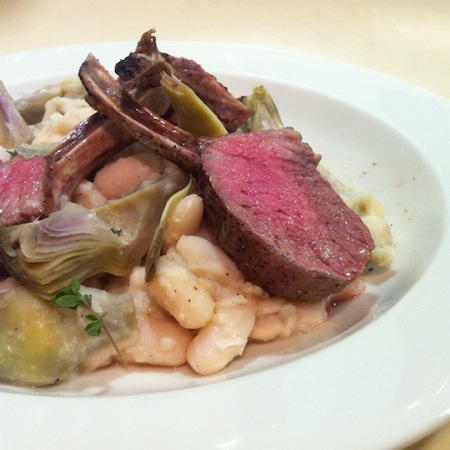 160 g Cannellinibohnen über Nacht in kaltem Wasser einweichen, abtropfen, mit frischem Wasser aufkochen, ca. 40 Min. köcheln. Saft von 1/2 Zitrone auspressen und mit 1 TL Salz und 4 Zweiglein Thymian zu den Bohnen geben. 5-6 kleine Artischocken rüsten (die äussersten Reihen Blätter der Artischocke grosszügig entfernen, restliche Blattspitzen um ca. 1/3 kürzen. Artischocken halbieren, Heu entfernen und sofort zu den Bohnen in den Sud geben, ca. 15 Min. mitköcheln, abtropfen und in mundgerechte Stücke schneiden. Derweil 1 Lammrack (ca. 300 g) mit Olivenöl einreiben. Mit 1 TL Meersalz und einigen Umdrehungen grob gemahlenem schwarzem Pfeffer bestreuen. Lammrack im vorgeheizten Backofen bei 180° C 20 Min. garen. Die Hälfte der Bohnen mit etwas Gemüsebouillon, einem guten Schuss Olivenöl und dem Saft 1/2 Zitrone pürieren. Salzen und pfeffern. Cannellinipüree, ganze Bohnen und Artischocken in einer Bratpfanne mischen und noch einmal erwärmen. Falls nötig etwas Bouillon zugeben. Cannellinibohnen und Artischocken auf 2 Tellern anrichten. Lammrack zerteilen und auf den Bohnen anrichten. Quelle: Kraut und Rüben [Betty Bossi]