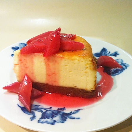 Backofen auf 160° C vorheizen. Springformboden mit Backpapier bespannen. Rand mit Butter bestreichen und mit Mehl bestäuben. 170 g Ingwerguetzli mit einem Wallholz zerkrümeln. In einer Schüssel mit 70 g in Stücke geschnittener Butter mischen. Guetzlimischung auf dem Springformboden verteilen, gut andrücken und kühl stellen. 400 g Frischkäse, 150 g Crème fraîche, 100 g Zucker, 2 EL Maizena und 2 Eier zu einer glatten Masse rühren. In die Form giessen. In der unteren Ofenhälfte ca. 60 Minuten backen. Ofen ausschalten und Tür öffnen. Kuchen im Ofen auskühlen lassen. 200 g Rhabarber schräg in 2 cm lange Stücke schneiden und in eine ofenfeste Form geben. 1/3 Vanilleschote längs aufschneiden, Samen auskratzen. Rhabarberstrücke mit Vanille, 0.5 dl Weisswein, 3 EL Zucker und Schale von 1/2 Zitrone im vorgeheizten Backofen bei 180° C 20 Min. backen. Erkalten lassen. Cheesecake in Stücke schneiden, mit dem Rhabarberkompott belegen und mit Rhabarbersirup beträufeln.