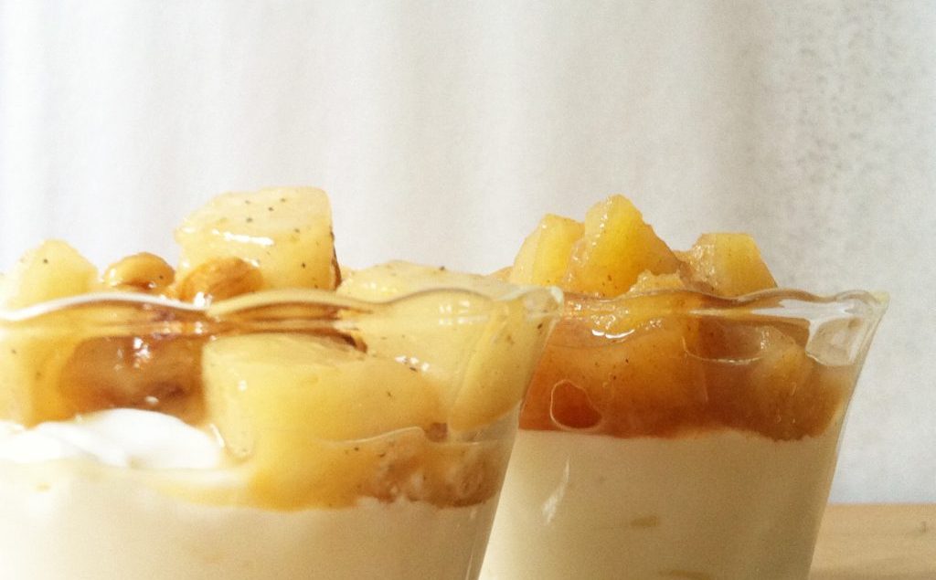 2 weichkochende Äpfel (z.B. Boskoop) und 2 festkochende Äpfel (z.B. Golden Delicious) schälen, vierteln, Kerngehäuse entfernen und in mundgerechte Stücke schneiden. Apfelstücke in einer Pfanne zusammen mit einem Spritzer Zitronensaft, 2 EL Ahornsirup und 1 TL gemahlenem Zimt erhitzen. Etwa 20 Min. düsten bis die Boskoopapfelstücke zu Mus zerfallen und die Golden Deliciousapfelstücke weich sind. Abkühlen lassen und zu abgetropftem Joghurt servieren. Quelle: Cookie and Kate