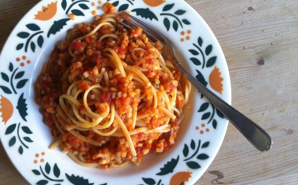 10 g getrocknete Steinpilze in lauwarmen Wasser einweichen. 200 g Sellerie, 100 g Rüebli, 100 g Pastinaken, 1 kleine Zwiebel und die abgetropften Steinpilze in feine Würfelchen schneiden. Die Gemüse- und Steinpilzwürfelchen in einem guten Schuss Olivenöl anbraten. 1 EL Tomatenpüree kurz mitbraten. Mit 1 dl Weisswein ablöschen. Einkochen lassen. 1 grosse Dose Pelati (800 g) hacken und zufügen. Mit Salz abschmecken. 1 Lorbeerblatt mitkochen. 1 Std. köcheln lassen. 300 g Linguine al dente kochen und abgetropft mit dem Wurzelgemüsesugo mischen. Nach Bedarf etwas Pastawasser zugeben. Auf 4 Tellern verteilen.
