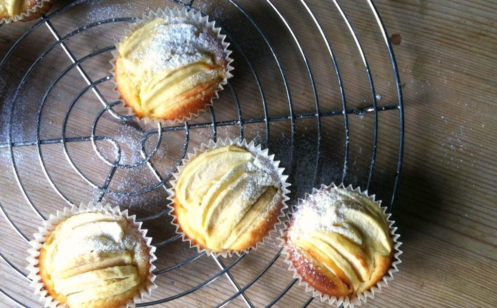 3-4 kleine säuerliche Äpfel (ca. 400 g) schälen, vierteln, entkernen und in Schnitze schneiden. Je 2 EL Zucker und Zitronensaft in einer kleinen Pfanne aufkochen. Pfanne vom Herd nehmen. Apfelschnitze beigeben und kurz im Sirup wenden. Etwa 15 Min. ziehen lassen. Derweil für den Rührteig je 120 g weiche Butter und Zucker mit dem Mixer ca. 3 Min. rühren. 2 Eier nacheinander beifügen und weiterrühren, bis die Masse heller ist. 1 Prise Salz, 2 EL Zitronensaft und Abgeriebenes von 1 Zitrone dazugeben. 150 g Mehl und 1 EL Backpulver mischen und zusammen mit 0,5 dl Rahm kurz unter die Masse rühren. Muffinblech mit 12 Papierförmchen bestücken. Teigmasse auf die Papierförmchen verteilen. Je 5-6 Apfelschnitze fächerartig leicht in den Teig drücken. In der Mitte des auf 180° C vorgeheizten Ofens ca. 25 Min. backen. Auf einem Gitter auskühlen lassen. Mit Puderzucker bestäuben. Quelle: Coopzeitung
