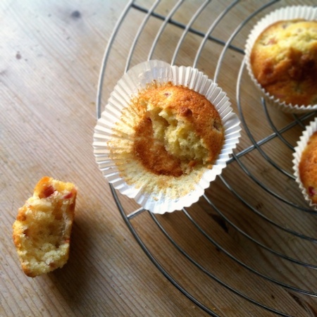 Für den Rührteig 90 g weiche Butter, 90 g Puderzucker und das Mark einer halben Vanilleschote mit dem Mixer ca. 3 Min. rühren. 2 Eier nacheinander beifügen und weiterrühren, bis die Masse heller ist. 100 g Rhabarber und 50 g Marzipan klein würfeln und mit 1 EL Mehl bestäuben. Beides mit 100 g Mehl und 1 TL Backpulver mischen und zusammen mit 2 EL Rahm kurz unter die Masse rühren. Muffinblech mit 10 Papierförmchen bestücken. Teigmasse auf die Papierförmchen verteilen. In der Mitte des auf 180° C vorgeheizten Ofens ca. 25 Min. backen. Auf einem Gitter auskühlen lassen. Quelle: Migros-Magazin