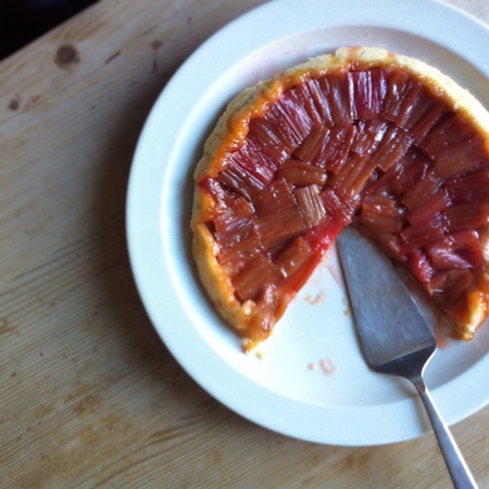 Supplement: Die klassische Tarte Tatin soll Ende des 19. Jahrhunderts von den beiden Schwestern Stéphanie und Caroline Tatin zufällig erfunden worden sein: einer der besagten Demoiselles sei die frisch gebackene Apfeltarte mit der Apfelseite voran zu Boden gefallen. Das Missgeschick auffangend habe sie den Kuchen ein zweites Mal, diesmal kopfüber, gebacken und wiederum, diesmal vorsätzlich gestürzt, serviert. Die wunderbare Rhabarbertartevariante kann aber kein Zufall sein. Das durch den süssen Caramel verwandelte herb-saure Gemüse harmoniert zu gut mit der puderig-dumpfen Note der Tonkabohne.