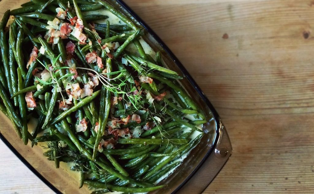 1 Zwiebel hacken. 60 g Bacon oder Bratspeck in Würfelchen schneiden. Zwiebeln und Speck in einer Bratpfanne andünsten. 600 g gerüstete Bohnen (Stangenbohnen oder Buschbohnen oder beides zusammen) beigeben, kurz mitdünsten. 0,5 dl Bouillon dazugiessen. Bohnen zugedeckt knapp weich kochen. 1 dl Rahm, 1 EL grobkörniger Senf und 3 Zweiglein Bohnenkraut unter die Bohnen mischen. Mit Salz und frisch gemahlenem schwarzem Pfeffer abschmecken. In eine Gratinform geben. Im auf 180° C vorgeheizten Backofen ca. 20 Min. gratinieren.