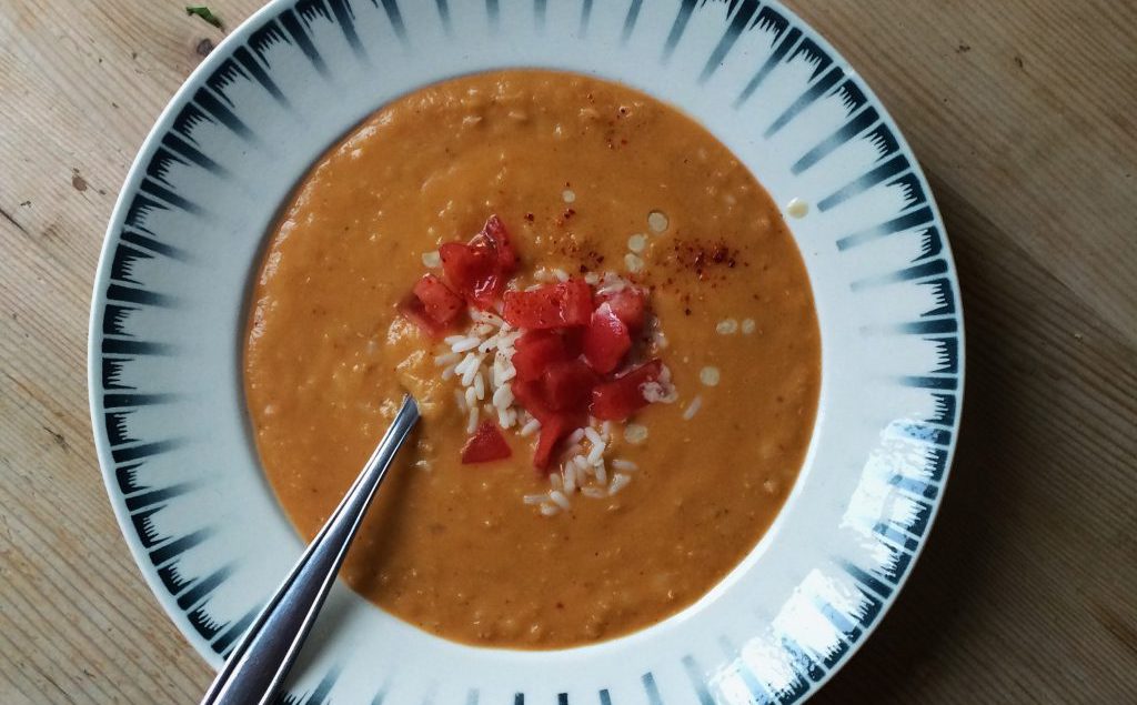 1 Schalotte fein hacken und in 1 EL Öl andünsten. 2 EL Tomatenpüree und je 1/2 TL Piment d’Espelette und Paprika mitdünsten. 400 g rote Linsen beifügen. Noch kurz weiter dünsten und mit 2 l Gemüsebouillon aufgiessen. Köcheln lassen, bis die Linsen gar sind. Inzwischen 80 g Langkornreis separat kochen. 2 Tomaten häuten, entkernen und in Würfel schneiden. Eine Kelle Linsen aus der Pfanne nehmen und den Rest pürieren, Linsen wieder zur Suppe geben. Den gekochten Reis und die Tomatenwürfel dazugeben. Mit dem Saft 1/2 Zitrone und allenfalls etwas Salz und Pfeffer abschmecken. 2 EL Tahini beigeben. Mit etwas Piment d’Espelette bestreuen. Reicht für 6 Personen. Quelle: Tine Giacobbo & Katharina Sinniger: Das Suppenkochbuch