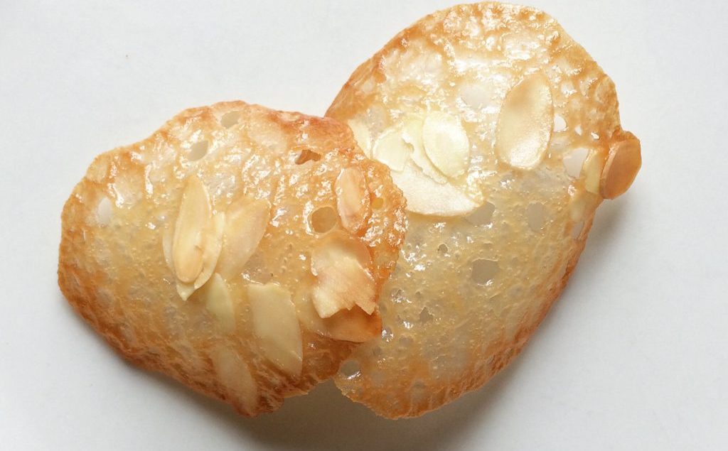 Supplement Für gebogene Tuiles jeweils nur 3 Kugeln aufs Mal backen, noch warm über ein Rundholz legen, damit sie sich biegen. Auskühlen lassen. Statt Mandelblättchen Sesamsaat verwenden.