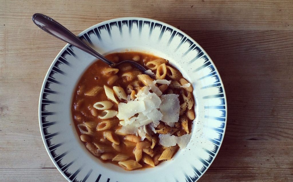 250 g getrocknete Canellinibohnen abspülen und über Nacht in 2 l kaltem Wasser einweichen. 1 fein gehackte Zwiebel in 2 EL Olivenöl ca. 10 Min. dünsten ohne Farbe annehmen zu lassen. 1 gehackte Knoblauchzehe beigeben und 1 Min. weiterdämpfen. 2 gute EL Tomatenpüree, 1 EL fein gehackter frischer Rosmarin und die eingeweichten Bohnen samt Einweichwasser dazu geben. Zugedeckt ca. 1 Std. köcheln, bis die Bohnen weich sind. Die Hälfte der Bohnen pürieren. Bohnenpüree zurück in die Pfanne geben. 120 g Pasta (z.B. Ditali) dazugeben und weichkochen. Allenfalls mit Wasser zur gewünschten Konsistenz verlängern. Mit Salz und frisch gemahlenem schwarzem Pfeffer abschmecken. Auf 4 Teller verteilen und mit Parmesanspänen servieren. Quelle: Delia Smith