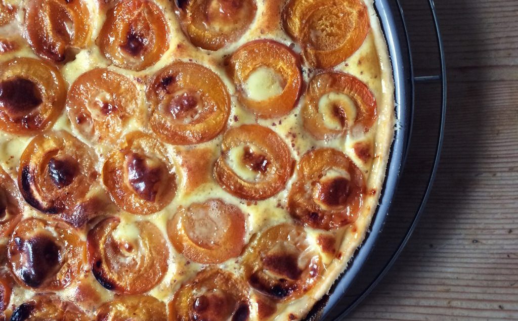 Für den Kuchenteig 200 g Mehl mit 1 Prise Salz und 80 g Butter krümelig reiben. 0,6 dl Wasser dazu geben und rasch zu einem Teig zusammenfügen. 30 Min. kühl stellen. Teig anschliessend zwischen 2 Backpapieren rund auswallen. Ein Kuchenblech (28-30 cm ø) mit Kuchenteig belegen, mit einer Gabel mehrmals einstechen. 800 g Aprikosen halbieren. 4 EL gemahlene Mandeln auf dem Teigboden verteilen. Aprikosenhälften darauf verteilen. 2,5 dl Halbrahm, 3 Eier und 3 gehäufte EL Zucker zu einem Guss verrühren. Guss über die Aprikosen giessen. Im vorgeheizten Backofen bei 200° C Unterhitze 45 Min. backen. Quelle: Elisabeth Fülscher: Kochbuch