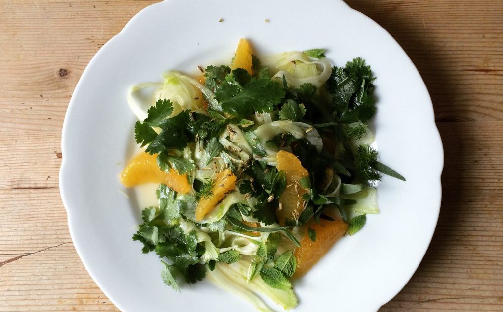 2 Fenchelknollen mit dem Gemüsehobel fein hobeln. 4 Orangen filetieren, dabei den Orangensaft auffangen. Orangensaft mit je 4 EL Zitronensaft und Olivenöl und 1 guten Prise Salz mischen. 2 TL Fenchelsamen rösten und grob hacken. Sauce zu den Fenchelspänen und Orangenfilets geben. Fenchelsamen, gehacktes Fenchelkraut, 50 g Koriander-, 20 g Estragon- und 10 g Minzeblätter dazugeben. Alle Zutaten behutsam mischen. Auf 4-6 Tellern anrichten. Quelle: Yotam Ottolenghi