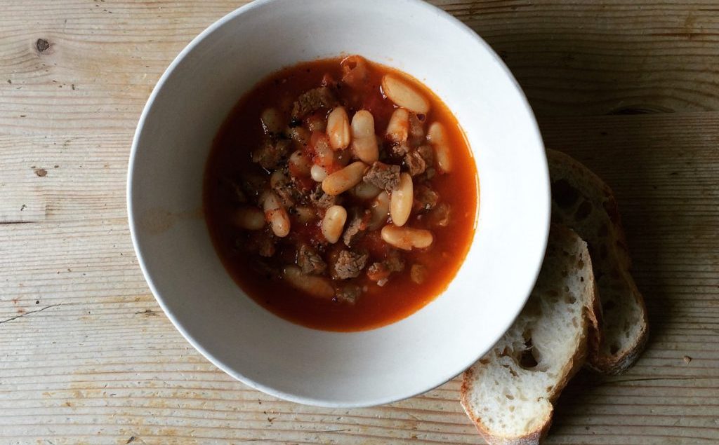 125 g getrocknete weisse oder Canellinibohnen abspülen und über Nacht in kaltem Wasser einweichen. Einweichwasser abgiessen. Bohnen mit frischem Wasser aufsetzen und ca. 1 Std. weichkochen. 250 g Rindsvoressen in kleine Würfel schneiden. 1 Zwiebel und 1 Knoblauchzehe fein hacken. Zwiebel- und Knoblauchwürfel in 2 EL Öl andünsten. Rindfeischwürfel, 1 Dose gehackte Pelati (400 g) und 2 Prisen Salz dazugeben. Mit 8 dl Bohnensud ablöschen. Zugedeckt ca. 1.5 Std. köcheln lassen. Mit Salz und frisch gemahlenem schwarzem Pfeffer abschmecken. Auf 4 Teller verteilen und servieren. Quelle: Séverine Vitali/Ursula Markus, Heimat im Kochtopf