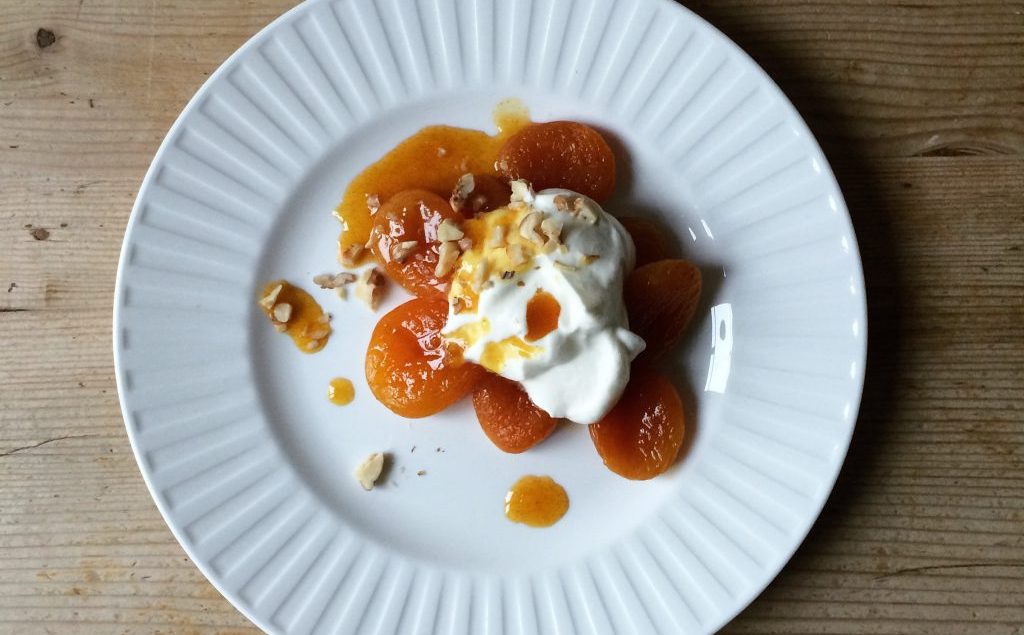 200 g getrocknete Aprikosen mit 2 dl frisch gepresstem Orangensaft, 1 EL Zucker und 1/2 TL Zimt aufkochen. Hitze reduzieren und 15 Min. köcheln lassen. Aprikosen aus der Pfanne nehmen und zur Seite stellen. Falls zu dünn, den Orangensirup zusätzlich zur gewünschten Konsistenz einkochen lassen. Abkühlen lassen. 4 EL Baumnüsse in einer Bratpfanne rösten, auskühlen lassen und grob hacken. 1 dl Rahm flaumig schlagen. Aprikosen auf 4 Tellern verteilen, je einen Klacks Rahm dazugeben, mit Orangen-Zimtsirup beträufeln und mit gehackten Baumnüssen bestreuen. Quelle: Isabel Lezmi, Lisa Rienermann, Veronika Helvacioglu: Yemek