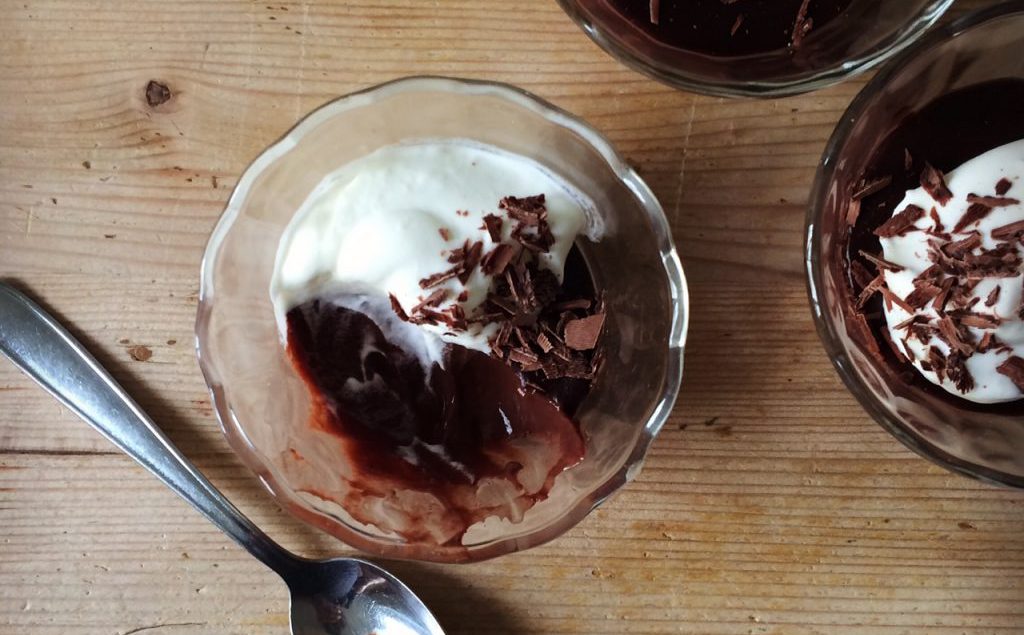 Supplement: Es gibt raffiniertere Desserts als diesen Schokoladenpudding. Wer aber als Kind Schoggi-TamTam mochte – und wie ich ab und zu immer noch mag – liebt diesen schnell gemachten Pudding ohne Eier umso mehr. Wie so oft kann auch dieses einfache Rezept vielfach variiert werden. Statt Crémant-Schokolade eine andere Sorte verwenden. Oder den Schokoladenpudding mit Gewürzen parfürmieren, mit Sternanis, Zimt, Tonkabohnen oder Schalen von Zitrusfrüchten zum Beispiel. Dafür die Milch mit den Gewürzen erhitzen und eine Weile ziehen lassen, absieben und erst danach die gehackte Schokolade dazu geben.