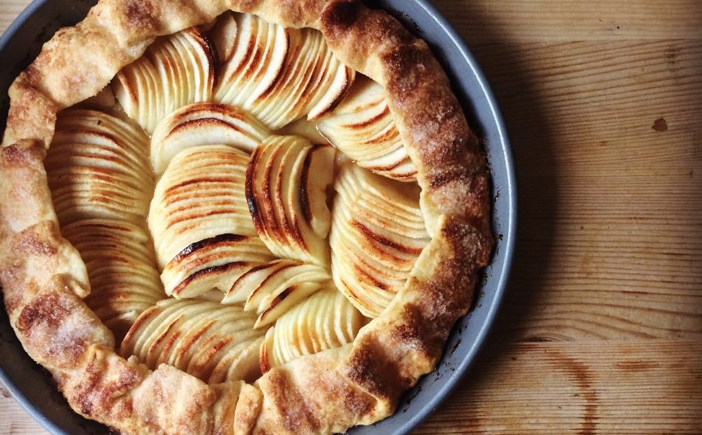 Für den Kuchenteig 125 g Mehl mit 1 Prise Salz und 80 g Butter krümelig reiben. 2 EL Wasser dazu geben und rasch zu einem Teig zusammenfügen. 30 Min. kühl stellen. Teig anschliessend zwischen 2 Backpapieren rund auswallen. Die ausgewallte Teigplatte sollte einen Durchmesser von ca. 35 cm haben. Ein Kuchenblech (22 cm Durchmesser) überlappend mit dem Kuchenteig belegen, mit einer Gabel mehrmals einstechen. 900 g Äpfel schälen, halbieren und Kerngehäuse entfernen (Kerngehäuse und Schalen nicht wegwerfen, sie werden später noch verwendet). Äpfel in feine Scheiben schneiden und auf den Teig geben. Überlappende Teigränder über die Äpfel legen. Teigränder mit 2 EL geschmolzener Butter bestreichen. Anschliessend mit 3 EL Zucker bestreuen. Im vorgeheizten Backofen bei 200° C 45 Min. backen. Derweil die Apfelschalen und Kerngehäuse in eine Pfanne geben, 100 g Zucker dazu geben und knapp mit Wasser bedecken. Für 25 Min. köcheln lassen. Sirup durch ein feines Sieb abgiessen. Apfelkuchen etwas abkühlen lassen, anschliessend mit dem Apfelsirup bestreichen (nicht den Teig, nur die Früchte). Quelle: Alice Water