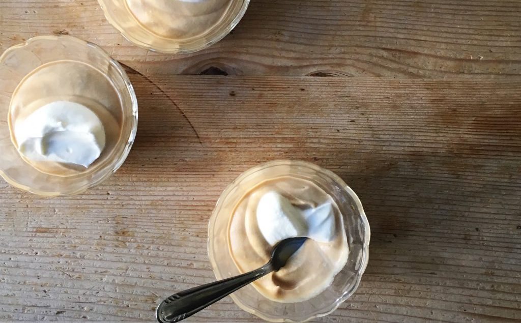 50 g Zucker und 1 Prise Salz mit 1 TL Wasser ohne Rühren aufkochen. Hitze reduzieren und köcheln, bis ein hellbrauner Caramel entsteht. 1 dl heissen Espresso dazugiessen und etwa 5 Min. köcheln lassen, bis sich der Caramel aufgelöst hat. Kalt stellen. 2,5 dl Rahm steif schlagen. 1/3 mit dem Espressosirup verrühren, den restlichen Rahm darunter ziehen. Mit zusätzlichem flaumig geschlagenem Rahm servieren. Quelle: Andreas Morel