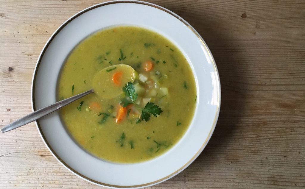 1 Zwiebel fein hacken und in 1 EL Butter andünsten. 300 g mehlig kochende Kartoffeln, 100 g Sellerie und 1 Rüebli in Würfel schneiden. 200 g Lauch längs halbieren und in Streifen schneiden. Gemüse beifügen und mitdünsten. Mit 1,5 l Gemüsebouillon aufgiessen. Etwa 25 Min. köcheln lassen. Eine Kelle Gemüse aus der Suppe nehmen und beiseite stellen. Suppe durchs Passe-vite drehen. Gemüsestücke wieder zur Suppe geben. Mit Muskatnuss und allenfalls etwas Salz abschmecken. 1 Handvoll glattblättrige Petersilie grob hacken und zur Suppe geben. Quelle: Splendid Delikatessen