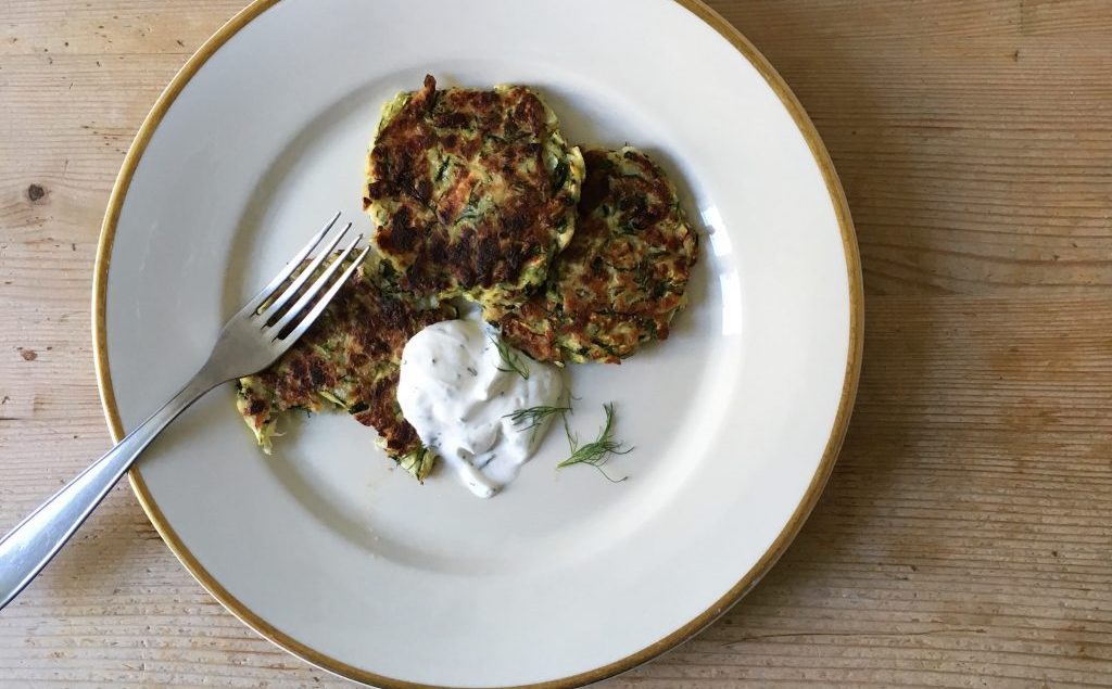 600 g Zucchini mit der Röstiraffel reiben. Gut ausdrücken (am besten in einem Gazetuch), so dass nur noch etwa 300 g Zucchiniraspel übrig bleiben. 60 g Feta fein zerkrümeln und dazu geben. 2 fein gehackte Frühlingszwiebeln, 1 fein gehackte Knoblauchzehe, 1 Handvoll gehackter Dill und 1 TL gemahlener Kreuzkümmel ebenfalls dazugeben und mischen. Mit Salz und Pfeffer würzen. 1 Ei und 60 g Mehl dazugeben und – am besten mit den Händen – noch einmal sorgfältig mischen. In einer Bratpfanne 2 EL Öl erhitzen. Je ein gehäufter Esslöffel Masse in die Pfanne geben und mit dem Löffel zu runden Küchlein formen. Bei mittlerer Hitze beidseitig je etwa 3 Min. goldbraun braten. Im Backofen warm halten, bis alle Küchlein gebacken sind (ergibt etwa 16 Stück). 180 g Joghurt mit 1 EL gehacktem Dill und 1 EL Zitronensaft mischen. Dill-Joghurt mit Salz abschmecken und zu den Küchlein servieren. Quelle: Nicole Stich