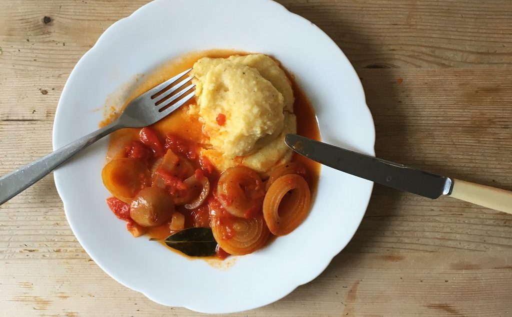 750 g Zwiebeln schälen und in etwa 1 cm dicke Scheiben schneiden. Zwiebeln in 50 g Butter (oder Olivenöl) andämpfen, 1 Dose Pelati (400 g) klein schneiden und mit dem Saft dazugeben. Salzen und pfeffern. Ein Lorbeerblatt dazugeben und mit 1 dl Bouillon ablöschen. Zugedeckt etwa 40 Min. köcheln lassen. Mit Polenta servieren. Quelle: Lilo Thelen
