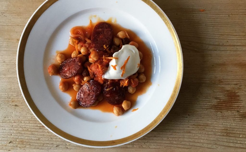 250 g Kichererbsen über Nacht in kaltem Wasser einweichen. Mit frischem Wasser, 1 Lorbeerblatt und 1 geschälten Knoblauchzehe aufkochen. Etwa 1 Std. köcheln. 2 Zwiebeln schälen, halbieren und in feine Spalten schneiden. 1 Knoblauchzehe fein hacken. In einer Pfanne 2 EL Olivenöl erhitzen und die Zwiebeln mit dem Knoblauch und 1 TL Kreuzkümmel (im Mörser leicht zerstossen) einige Minuten dünsten. 1 Dose Pelati (400 g) grob hacken. Pelati, die abgetropften Kichererbsen, 1/2 Zimtstange, 1-2 Streifen Orangenschale und nach Belieben 2-3 EL Rosinen dazugeben. Leicht salzen und ca. 45 Min. köcheln lassen. Allenfalls etwas Wasser dazugeben. Zimtstange und Orangenschale entfernen, mit Salz und Pfeffer abschmecken. 150 g Chorizo schräg in Scheiben schneiden und in einer Bratpfanne kurz anbraten. Kichererbsen auf 4 Teller verteilen, Chorizo mitsamt Fett darauf verteilen, je 1 EL saurer Halbrahm darauf setzen und mit etwas Orangenzesten garnieren. Quelle: Anna Pearson