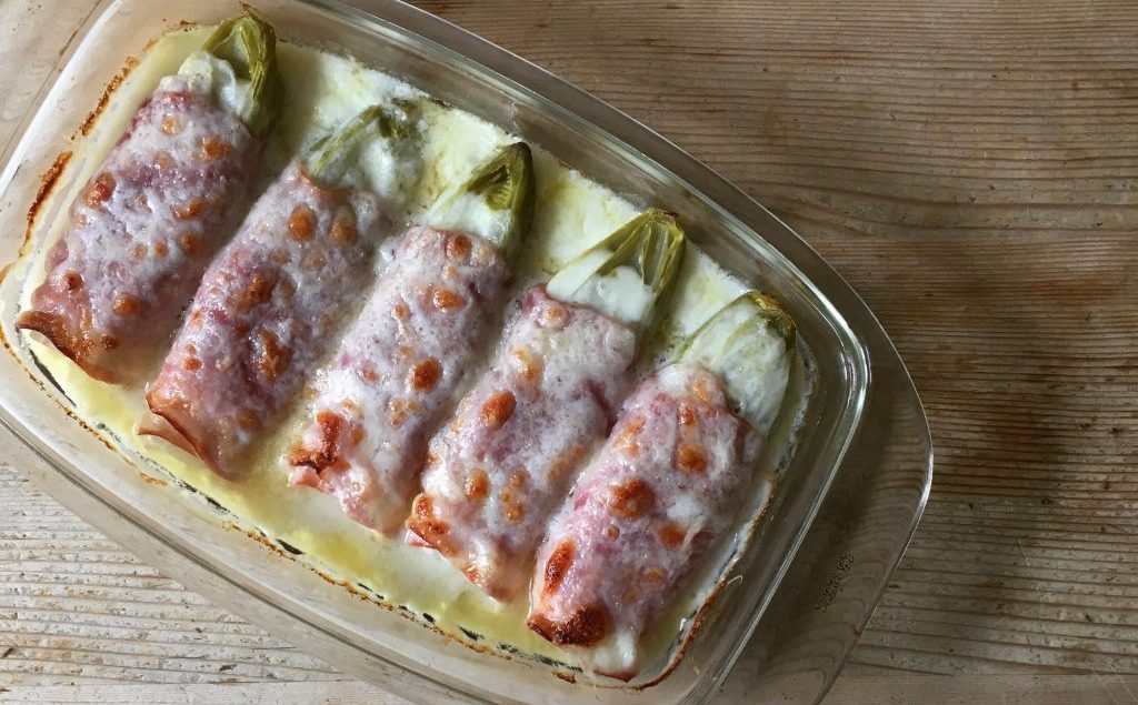4 Chicoréezapfen halbieren und ca. 5 Min. im Dämpfkörbchen dämpfen. Chicoréehälften mit je einer Scheibe Schinken umwickeln und in eine ausgebutterte Gratinform legen. In einer Pfanne 1 EL Butter schmelzen. Mit dem Schwingbesen 1 EL Mehl einrühren und aufschäumen lassen. Unter stetem Rühren 1,5 dl Chicoréesud und 1 dl Milch dazugiessen und bei kleiner Hitze 10 Min. köcheln lassen. 25 g geriebener Greyerzer dazugeben. Mit Salz, schwarzem Pfeffer und Muskatnuss würzen. Sauce über die Chicoréehälften giessen und 25 g geriebener Greyerzer darüber verteilen. Im vorgeheizten Backofen bei 200° C 15-20 Min. überbacken. Mit frischem Brot, Salzkartoffeln oder Reis servieren. Quelle: Coop Mittwochstudio