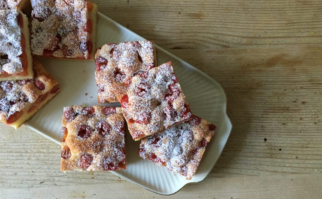 500 g Weichseln entsteinen (gibt etwa 400 g entsteinte Weichseln). Dies geht einfach mit einer Büroklammer: Dazu eine Büroklammer zur S-Form aufklappen. Mit dem kleineren Büroklammerbogen beim Stielansatz der Weichsel ansetzen, bis zum Kern einstechen, umdrehen bis der Weichselkern gelockert ist und abschliessend den Kern mit der Büroklammer herauspulen. Die Videoanleitung dazu gibt’s hier. 100 g zimmerwarme Butter mit 100 g Puderzucker und 1 EL Vanillezucker so lange rühren, bis sich Spitzchen bilden. Nach und nach 2 Eier dazu geben und rühren, bis die Masse hell ist. 1/2 EL Maraschino (oder Kirsch) ebenfalls darunterrühren. 100 g Mehl mit 1 Prise Salz und 1/2 TL Backpulver mischen und darunterziehen. Backform (ca. 20 X 20 cm) mit Backpapier auskleiden. Teig gleichmässig in die Form geben und glatt streichen. Weichseln auf dem Teig verteilen. 45 Min. im auf 180°C vorgeheizten Backofen backen. Auskühlen lassen, mit Puderzucker bestäuben und in 9 Quadrate schneiden. Quelle: Katharina Seiser