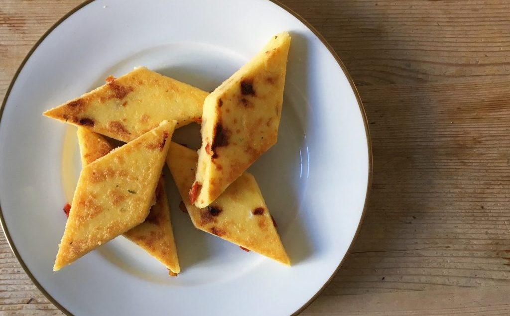 1 l Gemüsebouillon mit 2 EL Butter (30 g) aufkochen, 1 Knoblauchzehe dazupressen. 250 g Maisgriess unter Rühren einrieseln lassen, 2-3 Min. zu einem dicken Brei kochen. 100 g geriebener Bergkäse (oder je 50 g Parmesan und Greyerzer) darunter ziehen, 50 g getrocknete Tomaten fein schneiden und ebenfalls daruntermischen. 2 Eier verklopfen und unter den Maisbrei rühren. Mit Pfeffer abschmecken. Polenta ca. 2 cm dick auf ein Backpapier ausstreichen (etwa 30 cm ∅), mit einem zweiten Backpapier abdecken. Mindestens 1 Std. erkalten lassen. In Rauten schneiden. Etwas Butter in einer beschichteten Bratpfanne erhitzen und die Rauten beidseitig ca. 3 Min. goldbraun braten. Die Polentaschnitten schmecken warm mit einem Salat als einfaches Zmittag oder Znacht aber auch kalt als Proviant für Bergwanderungen oder fürs Büro. Quelle: Stefan Paul