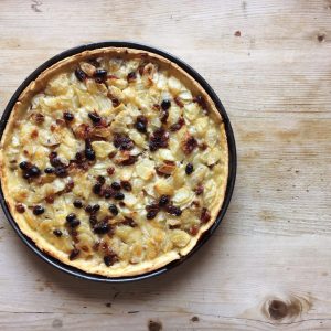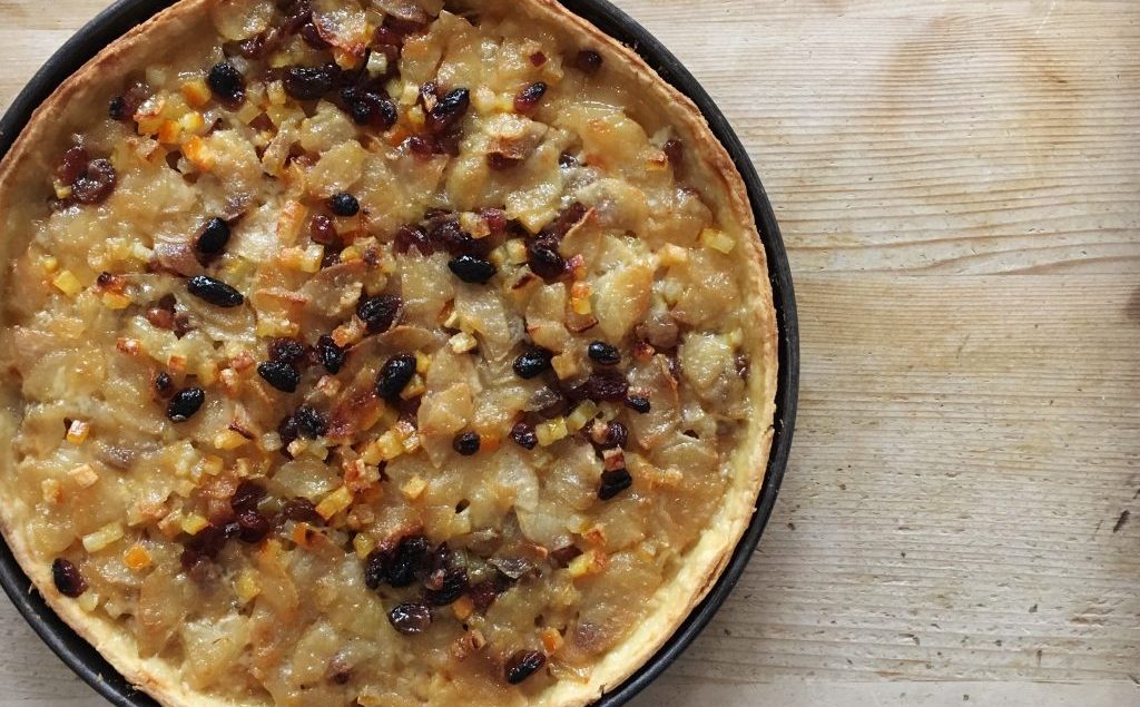 Für den geriebenen Teig 200 g Mehl und 1/2 TL Salz mit 90 g in Stücke geschnittener Butter krümelig reiben. 0,5 dl Wasser dazu geben. Zu einem Teig zusammenfügen (nicht kneten). Teig mindestens 30 Min. kühl stellen. Anschliessend zwischen zwei Backpapieren etwas flach drücken und rund ausrollen. Teig auf ein 24 cm grosses Kuchenblech legen. Überstehender Teig abschneiden, Teig mit einer Gabel dicht einstechen. 20 g Mehl, 30 g Zucker und etwas Zimtpulver verrühren und auf den Teigboden streuen. Für die Füllung 8 mittlere saftige Birnen, zum Beispiel Conférence (800 g) schälen, vierteln, Kerngehäuse entfernen und in feine Scheibchen schneiden. Birnen mit 50 g fein gehacktem Zitronat, 30 g fein gehacktem Orangeat, 100 g Sultaninen und 2 EL Baumnussöl mischen und auf dem Teig verteilen. 1 dl Rahm darübergiessen und mit 30 g Rohzucker bestreuen. Während 35-40 Min. auf der zweituntersten Rille im vorgeheizten Backofen bei 220° C backen. Quelle: Carlo Bernasconi, Union des paysannes et femmes rurales genevoises,