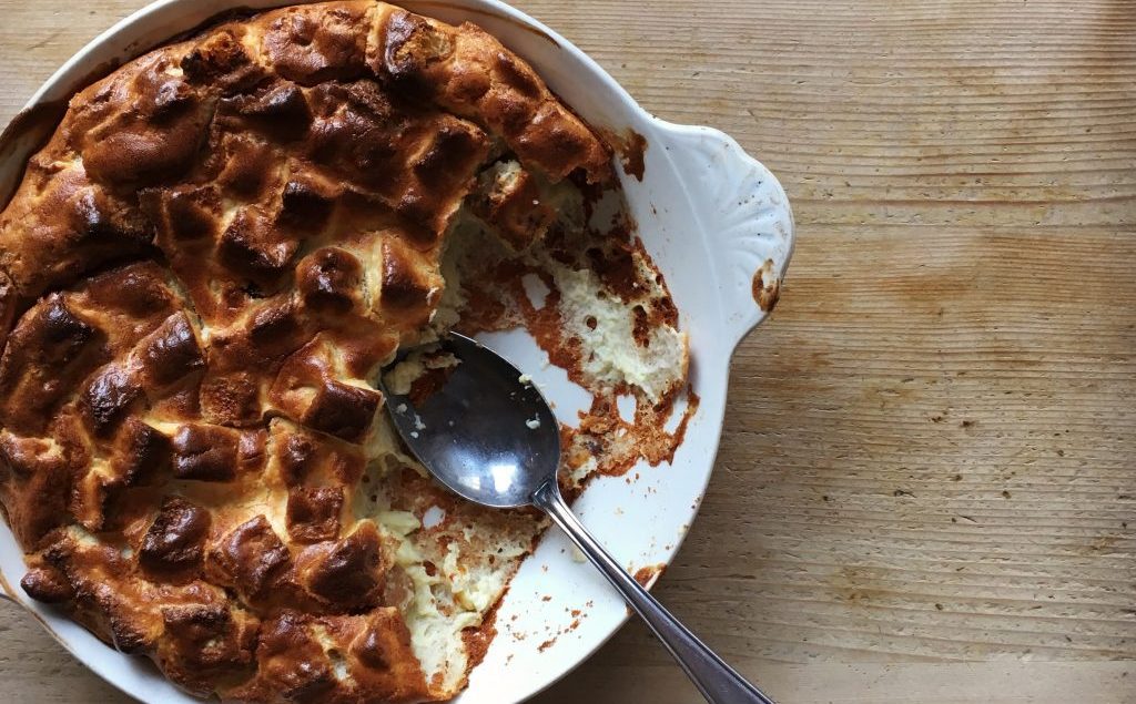 200 g Brot vom Vortag in Würfel schneiden. In 1 EL Butter goldbraun rösten. In eine bebutterte Auflaufform geben. 2 EL Mehl mit 3,75 dl Milch in eine Pfanne geben und unter Rühren aufkochen. Sobald die Sauce etwas ausgekühlt ist, 90 g geriebener Emmentaler und 3 Eigelb daruntermischen. 3 Eiweiss mit 1 Prise Salz steif schlagen. Eischnee unter die Masse ziehen. Mit Muskatnuss, Salz und Pfeffer würzen. Masse über die Brotwürfeli giessen. Den Brotauflauf im vorgeheizten Backofen bei 200° C 30-40 Min. backen. Quelle: Ämmitaler Chuchi ; hrsg. von Pro Emmental