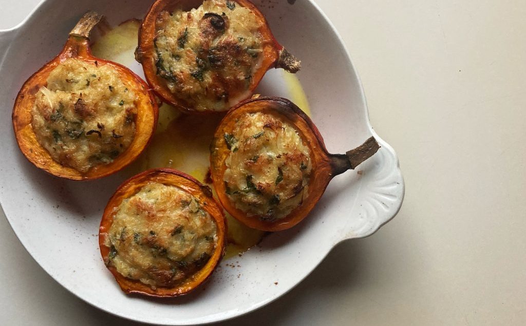 4 kleine Kürbisse (je etwa 300 g) halbieren und entkernen. In jede Kürbishälfte eine Prise Thymian und etwas Butter geben. Salzen und pfeffern. Im vorgeheizten Ofen bei 180° C 30 Min. backen. Derweil 2 Zwiebeln in feine Scheiben schneiden. In 2-3 EL Olivenöl langsam goldgelb dünsten. 1/2 Bund glattblättrige Petersilie grob hacken und beifügen. 250 g Sauerkraut (gekocht, abgetropft), 120 g geriebener Greyerzer und 100 g Doppelrahm dazugeben und mischen. Mit Salz und Pfeffer abschmecken. Vom Herd nehmen. Füllung in die Kürbishälften füllen und für weitere 20 Min. backen. Quelle: Nigel Slater, The Guardian [21.09.2020]