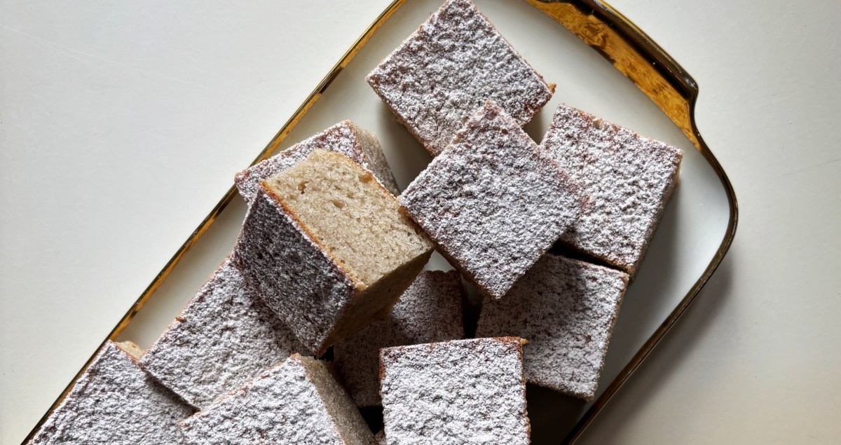 Für den Gewürzzucker 2 Stk. Sternanis, 1 TL Zimtblüten, 5 Stk. Nelken, 1 geh. TL Koriander, 1/2 TL schwarzer Pfeffer und die Samen von 4 Kardamomkapseln einzeln anrösten und abkühlen lassen. Mörsern und sieben. Mit Puderzucker im Verhältnis 1:9 mischen. 260 g reife, geschälte Bananen mit 155 g Zucker pürieren. 2 Eier einzeln unterrühren. 160 g Mehl mit 5 g Backpulver und 1 Prise Salz mischen und beifügen. 65 g flüssige Butter unter die Masse rühren. Eine quadratische Backform (20 x 20 cm) mit Backpapier auslegen. Den Teig einfüllen und glattstreichen. Im auf 190° C vorgeheizten Backofen ca. 30 Min. backen. Den Kuchen auf ein Kuchengitter stürzen und auskühlen lassen. Mit Gewürzzucker bestreuen (Selbstverständlich geht es auch einfacher, z.B. mit diesem Gewürzzuckerrezept oder gemahlenem Kardamom mit Puderzucker gemischt, auch eine gekaufte Gewürzzuckermischung passt). Den Kuchen in 16 Quadrate schneiden. Quelle: Tanja Grandits, Christophe Loeffel