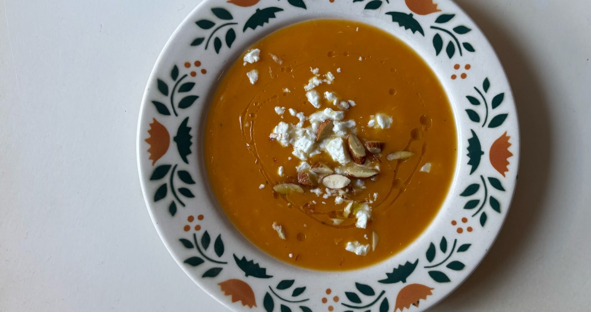 900 g Kürbis (z.B. Butternuss) rüsten und in ca. 2,5 cm grosse Stücke schneiden. 1 Zwiebel schälen und sechsteln. Gemüsestücke in einer Schüssel mit 2 EL Olivenöl mischen. Auf ein mit Backpapier belegtes Blech verteilen. Im vorgeheizten Backofen bei 180°C etwa 25 Min. rösten. Gemüsestücke anschliessend mit ca. 8 dl Gemüsebouillon aufkochen und pürieren. Falls nötig, mit Bouillon zur gewünschten Konsistenz verlängern. Die Suppe in Schalen anrichten und mit 80 g zerkrümeltem Feta, 30 g gehackten Rauchmandeln und etwas Olivenöl servieren. Quelle: fooby.ch