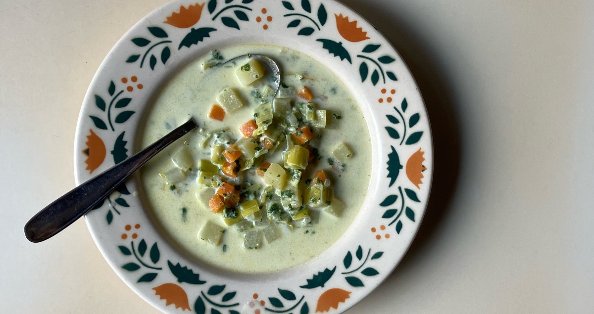 1 Zwiebel fein hacken und in 1 EL Butter andünsten. 200 g Lauch längs halbieren, dann in 1 cm grosse Quadrate schneiden und beigeben. 200 g Kartoffeln, 100 g Rüebli und 100 g Pfälzerrüebli (alternativ Kohlrabi, Pastinaken oder anderes Wurzelgemüse) schälen und 1 cm gross würfeln. Das Gemüse mitdünsten, dann mit 5 dl Gemüsebouillon ablöschen und 5 dl Milch dazugiessen. Die Suppe 20–25 Min. garen, bis das Gemüse weich ist. 80 g tiefgekühlten gehackten Spinat auftauen und in die Suppe geben – tiefgefrorener Spinat lässt sich in dieser Menge gut portionieren. Noch 5 Min. köcheln lassen. 150 g geriebenen Gruyère einrühren und schmelzen lassen, dann 1 dl Rahm dazugiessen. Mit Salz und Muskatnuss abschmecken und sofort servieren. Quelle: Das Bern-Kochbuch von Camilla Landbø und Claudia Salzmann, Swissmilk