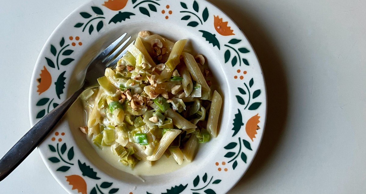 Penne mit Lauch-Käsesauce und gerösteten Haselnüssen